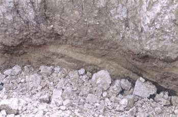 Después de que habían colocado la tubería, un compañero de trabajo, trabajando por encima de ellos a nivel del suelo, les entregó un poste de grado. Mientras colocaban el poste de grado dentro del extremo de la tubería para permitirles comprobar el grado de la línea de alcantarillado, una sección de la pared de la zanja desprotegida de 30 pies de largo por 11 pies de alto y varios pies de grosor se hundió (ver Figura 3). Una parte de esta sección caída golpeó a la víctima y a su compañero de trabajo, enterrándolos hasta la mitad del pecho y a su compañero de trabajo hasta las rodillas (Observe la figura 4).