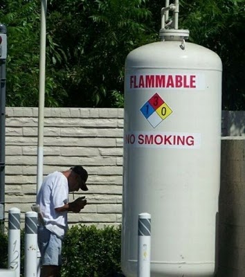 Well, you can’t say he wasn’t warned! Maybe he doesn’t speak English; maybe he just flat missed the “NO SMOKING” warning he’s directly facing; or maybe he’s so hard up for a cig that he just doesn’t care if lighting up could detonate an explosion.