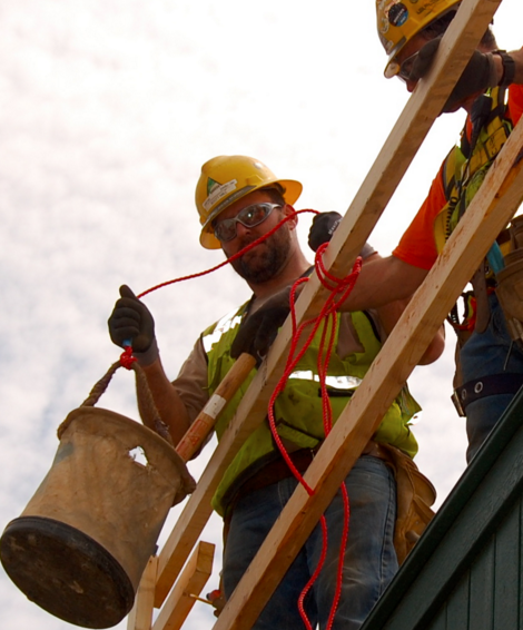 Picture This nearly always focuses on unsafe work practices, but this week we have a photograph showing workers doing the right thing. In this case, a worker is shown using a bucket and rope to hoist tools to an elevated work area. This arrangement allows workers to maintain three points of contact when ascending or descending ladders. (eLCOSH)