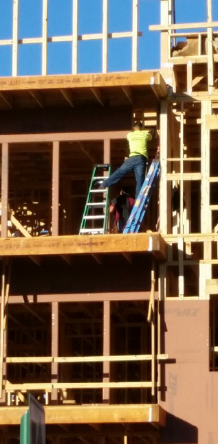 Doubling up on ladders is never a good thing. This construction worker was photographed standing with one foot on each of two stepladders at a Florida building site. If one of those ladders went sideways, this worker could fall backwards and end up permanently grounded. (Naval Safety Center)
