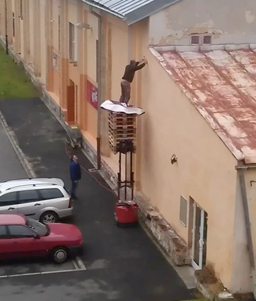 There is a right way and a wrong way to do things. Guess which method is illustrated here? A worker risks life and limb by standing on a stack of pallets piled on top of an aerial lift. To make matters worse, he is leaning forward to reach the wall, all without using any form of fall protection. (Fail Blog)
